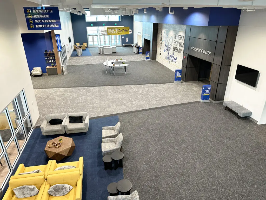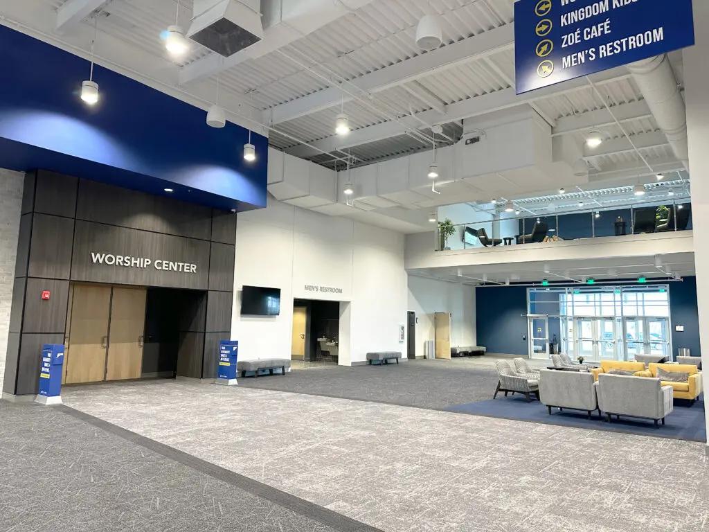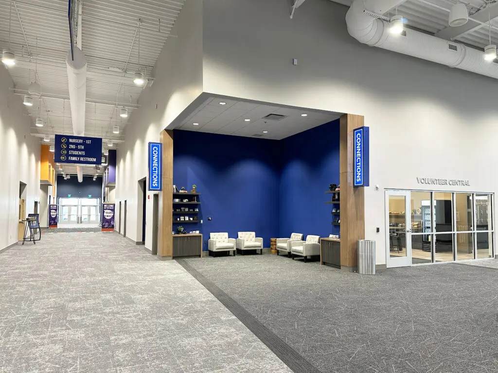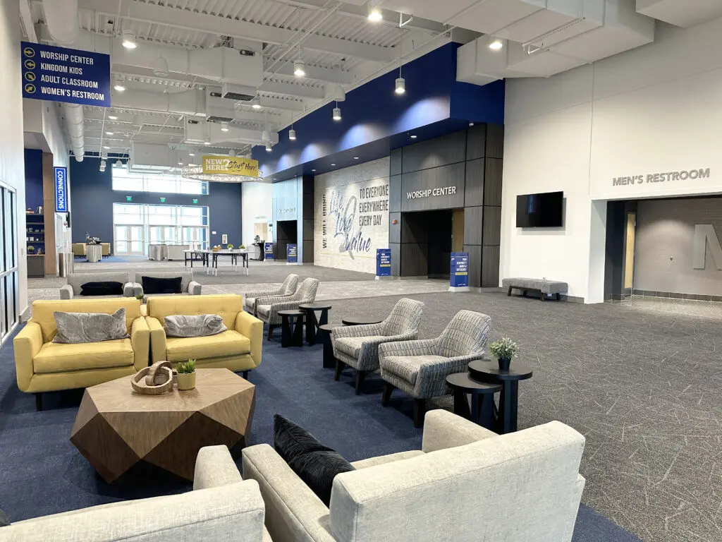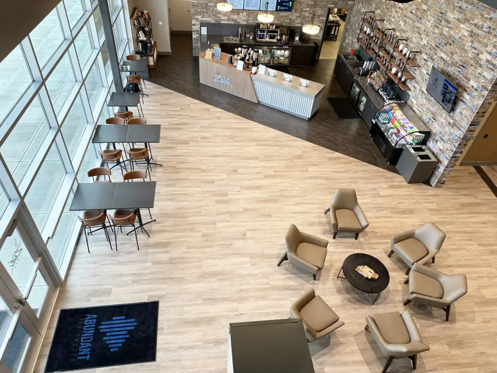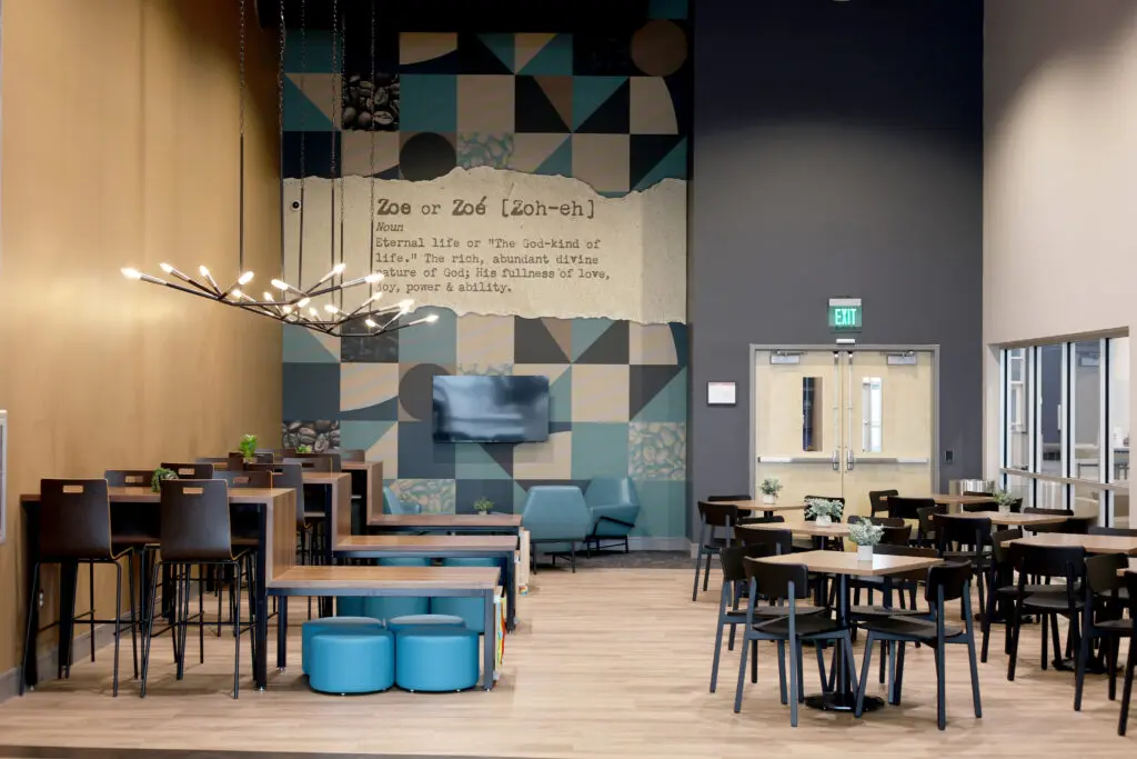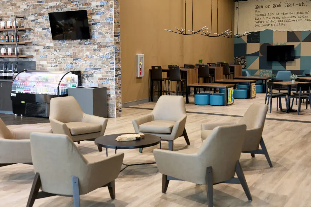 After years of continued growth at their Oakford campus, Abundant Life Church expanded into a new building across the street. The building houses a 1,300-seat Auditorium, children’s wing, full-service Café, and space for future offices. Pastor Charlie’s passion to bring life, love, and value to everyone, everywhere, every day is evident in the design of the building. There are places for everyone to feel comfortable, whether that’s serving in the children’s ministry on a Sunday morning or ministering to the community through the Café which gives all proceeds to local charities. The desire for a comfortable yet classy building was achieved by humanizing the scale of the tall ceilings with furniture elements and carpet patterns. The connections between finishes, furniture, and signage highlight Abundant Life’s trademark colors and the warm wood tones soften the space.