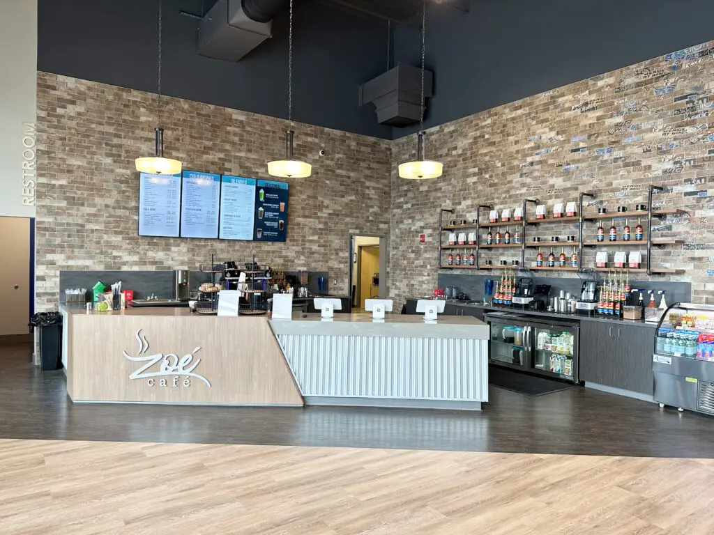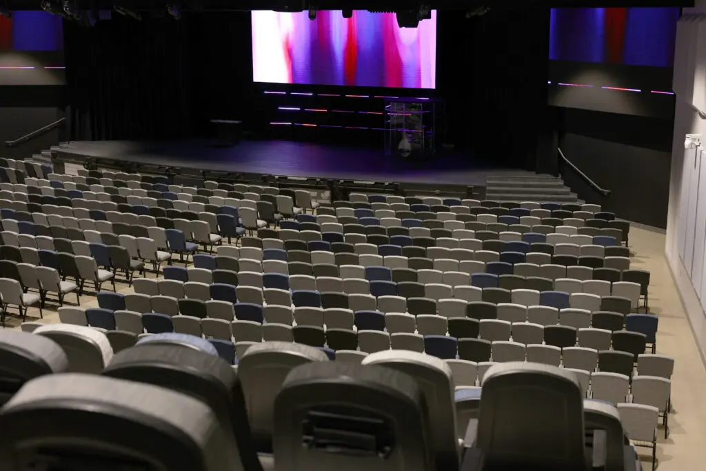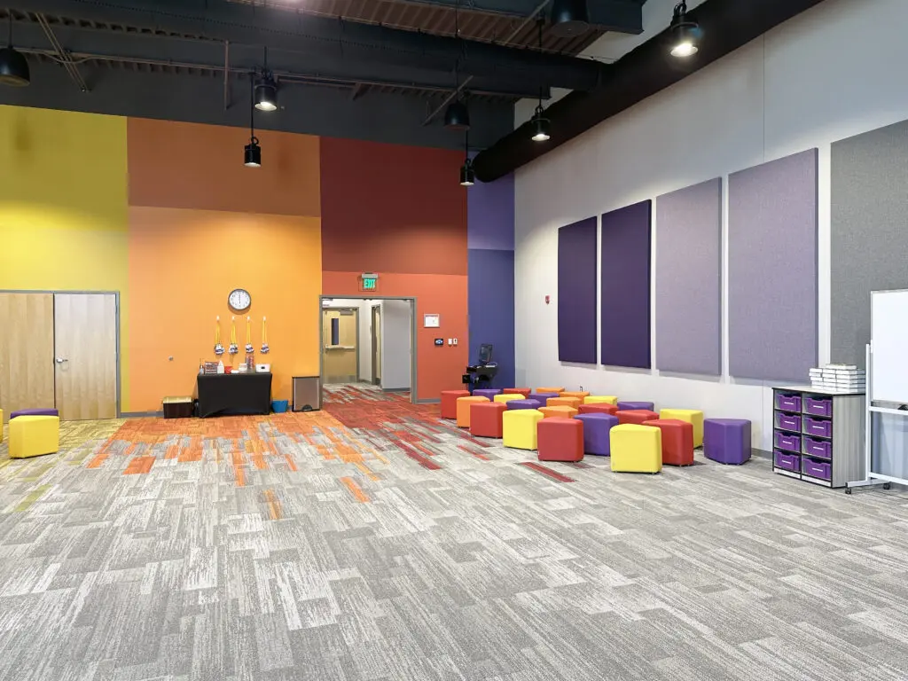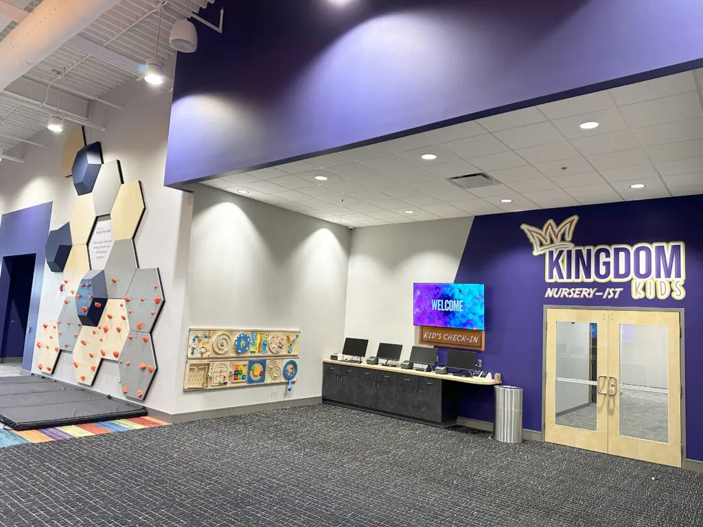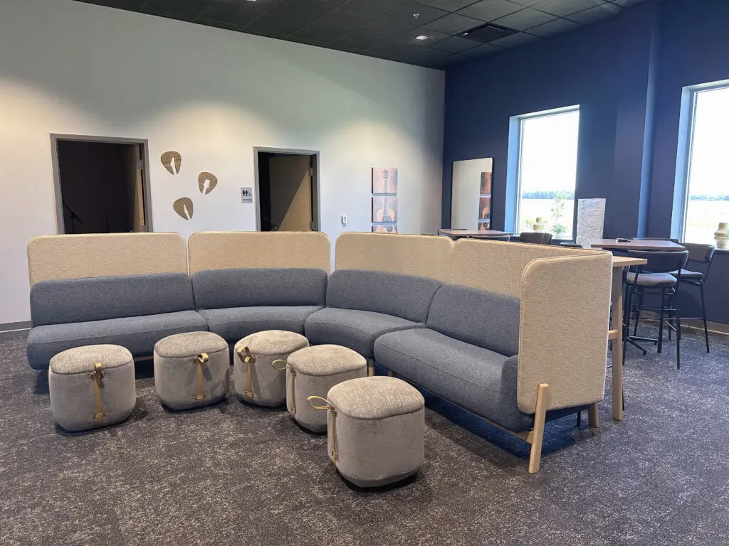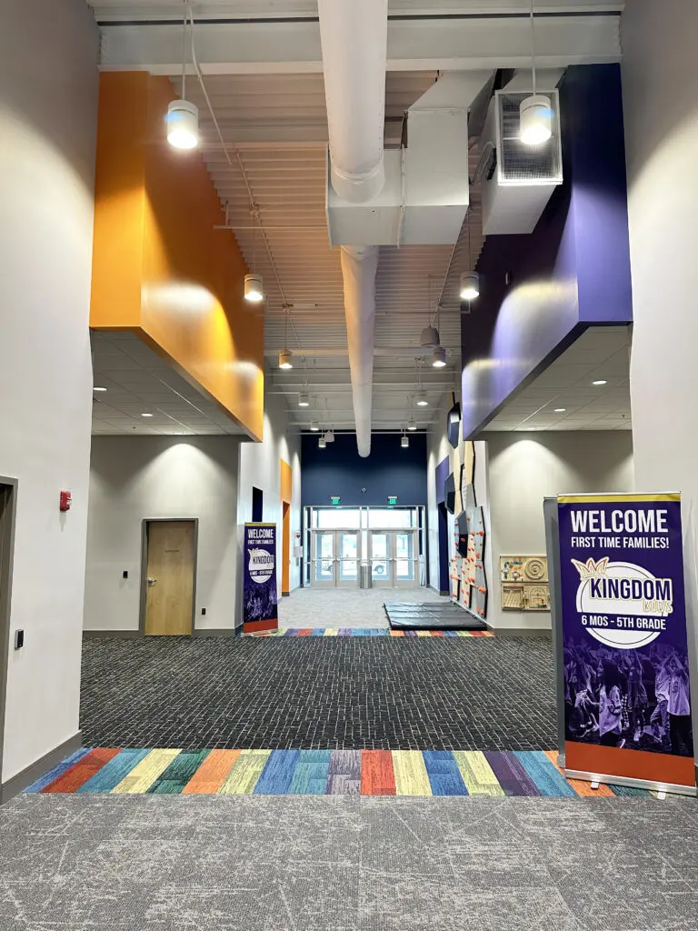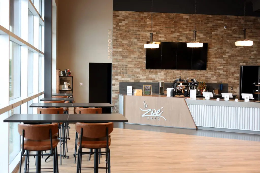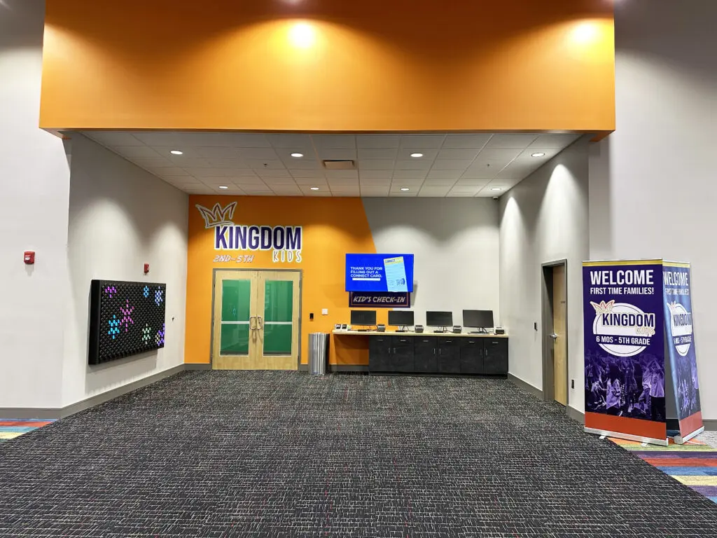 After years of continued growth at their Oakford campus, Abundant Life Church expanded into a new building across the street. The building houses a 1,300-seat Auditorium, children’s wing, full-service Café, and space for future offices. Pastor Charlie’s passion to bring life, love, and value to everyone, everywhere, every day is evident in the design of the building. There are places for everyone to feel comfortable, whether that’s serving in the children’s ministry on a Sunday morning or ministering to the community through the Café which gives all proceeds to local charities. The desire for a comfortable yet classy building was achieved by humanizing the scale of the tall ceilings with furniture elements and carpet patterns. The connections between finishes, furniture, and signage highlight Abundant Life’s trademark colors and the warm wood tones soften the space.