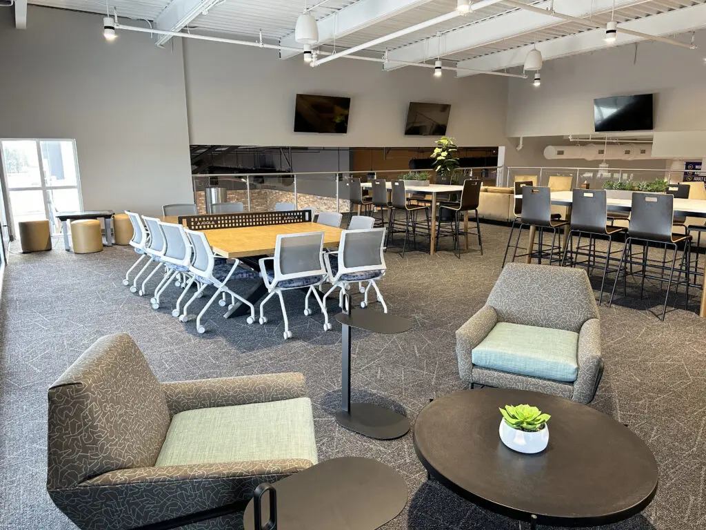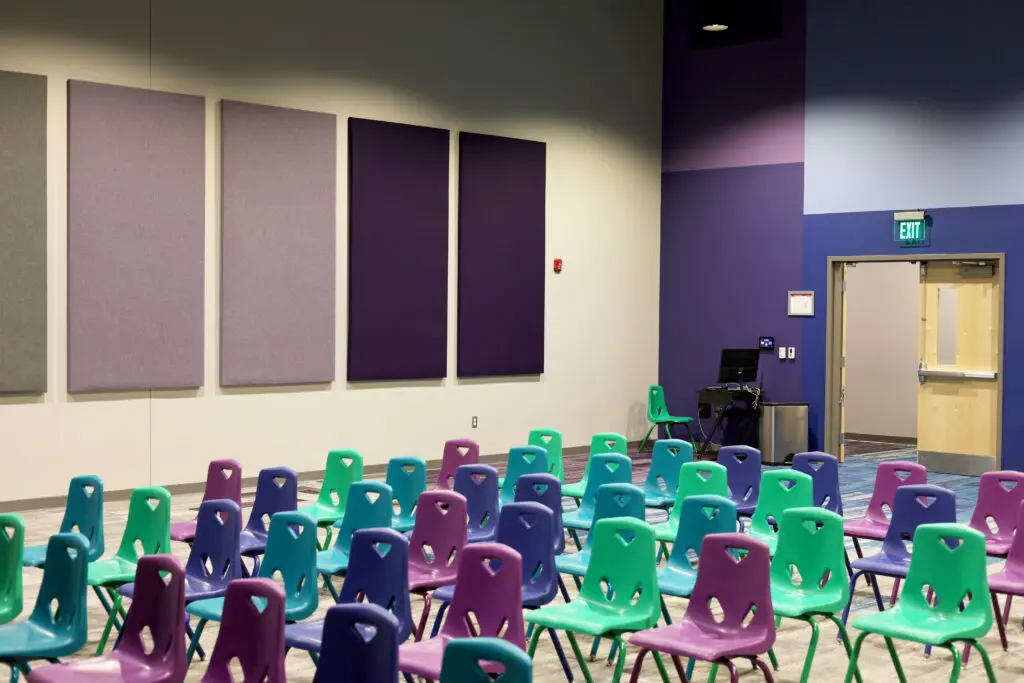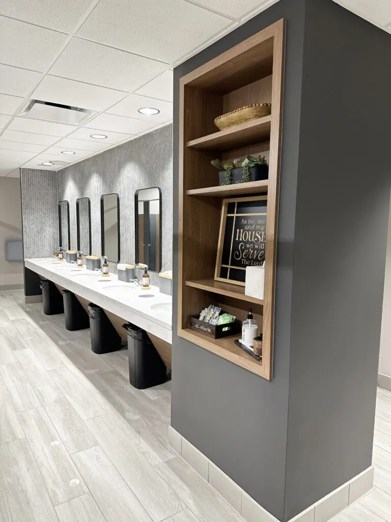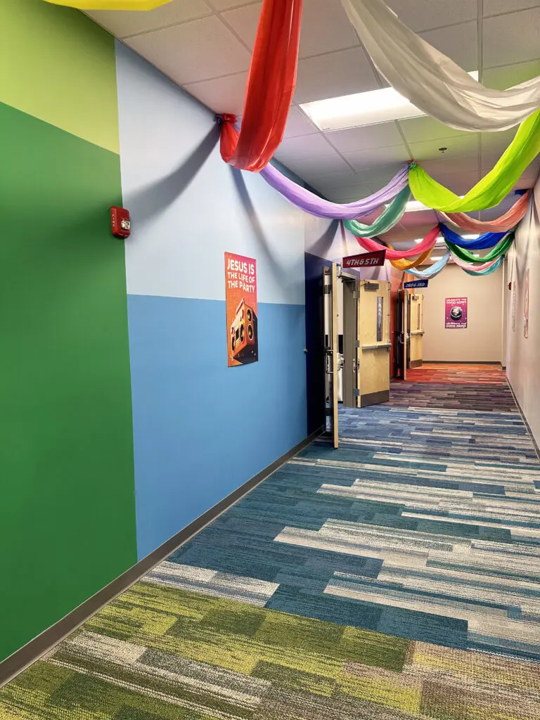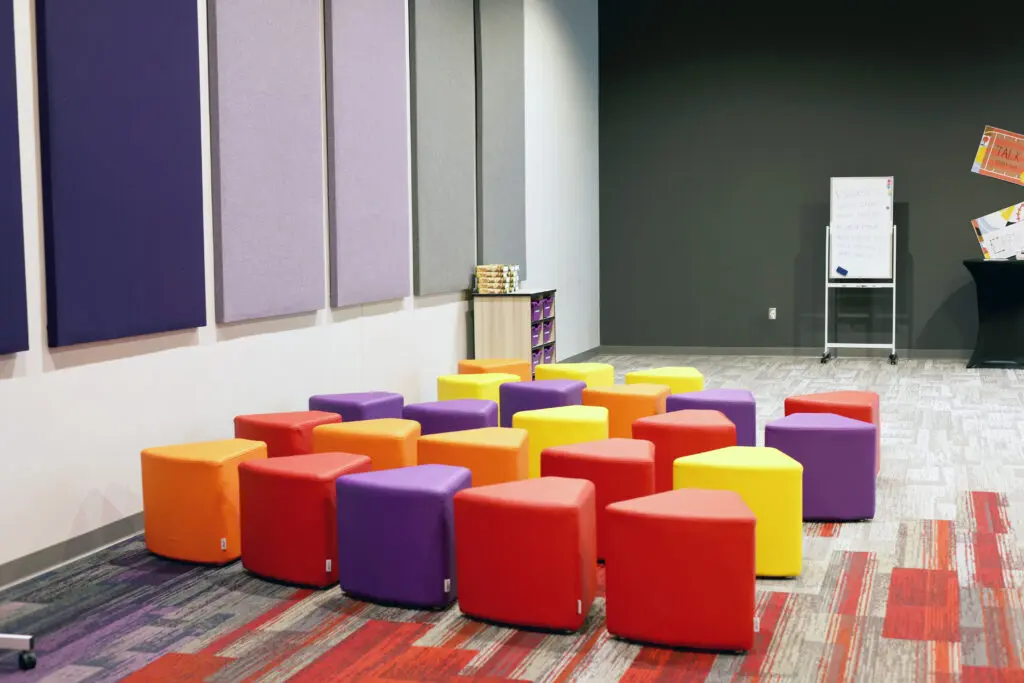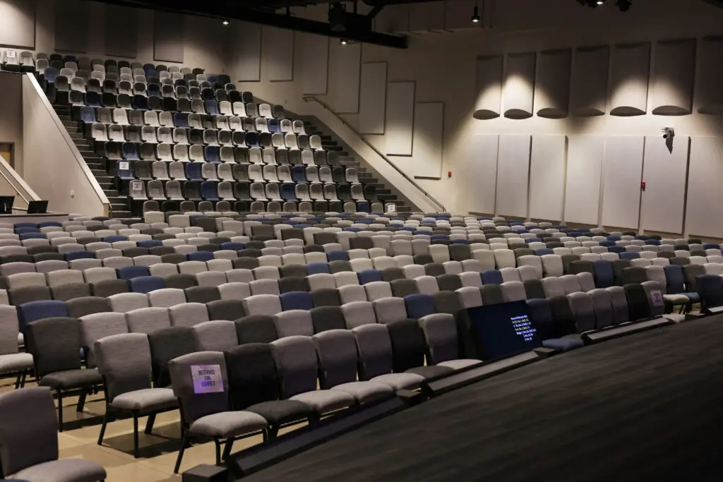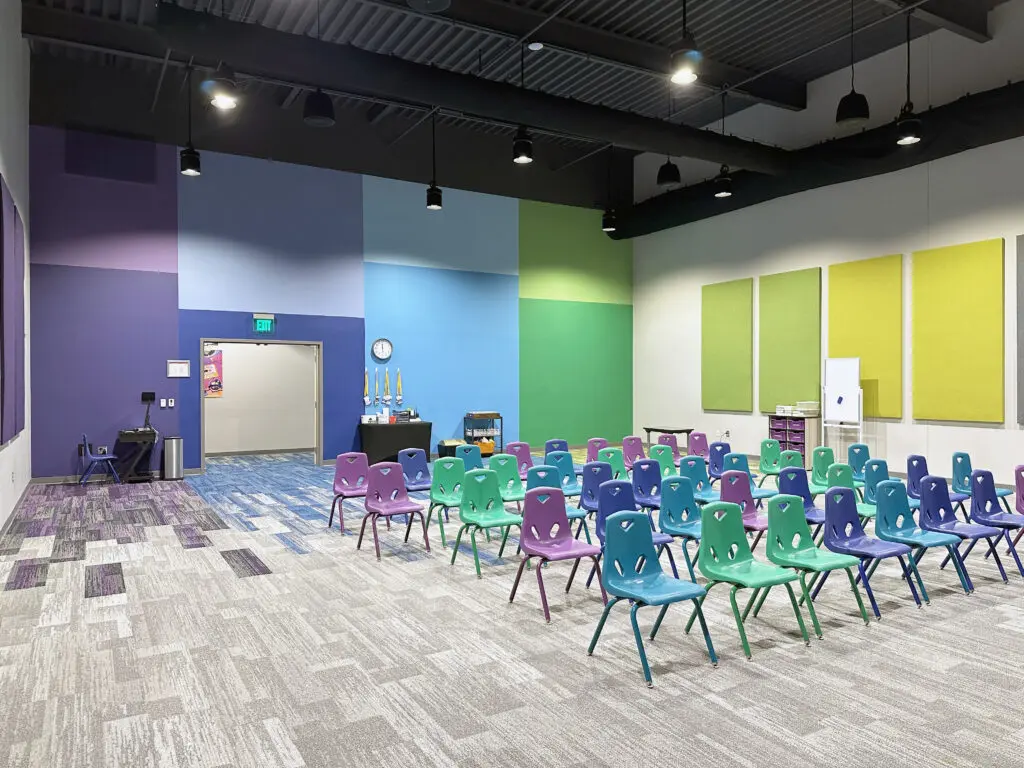 After years of continued growth at their Oakford campus, Abundant Life Church expanded into a new building across the street. The building houses a 1,300-seat Auditorium, children’s wing, full-service Café, and space for future offices. Pastor Charlie’s passion to bring life, love, and value to everyone, everywhere, every day is evident in the design of the building. There are places for everyone to feel comfortable, whether that’s serving in the children’s ministry on a Sunday morning or ministering to the community through the Café which gives all proceeds to local charities. The desire for a comfortable yet classy building was achieved by humanizing the scale of the tall ceilings with furniture elements and carpet patterns. The connections between finishes, furniture, and signage highlight Abundant Life’s trademark colors and the warm wood tones soften the space.