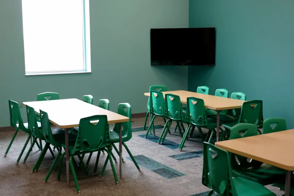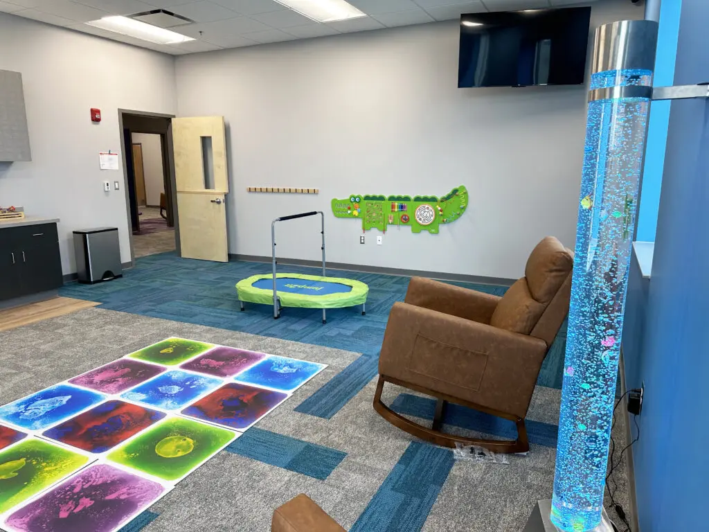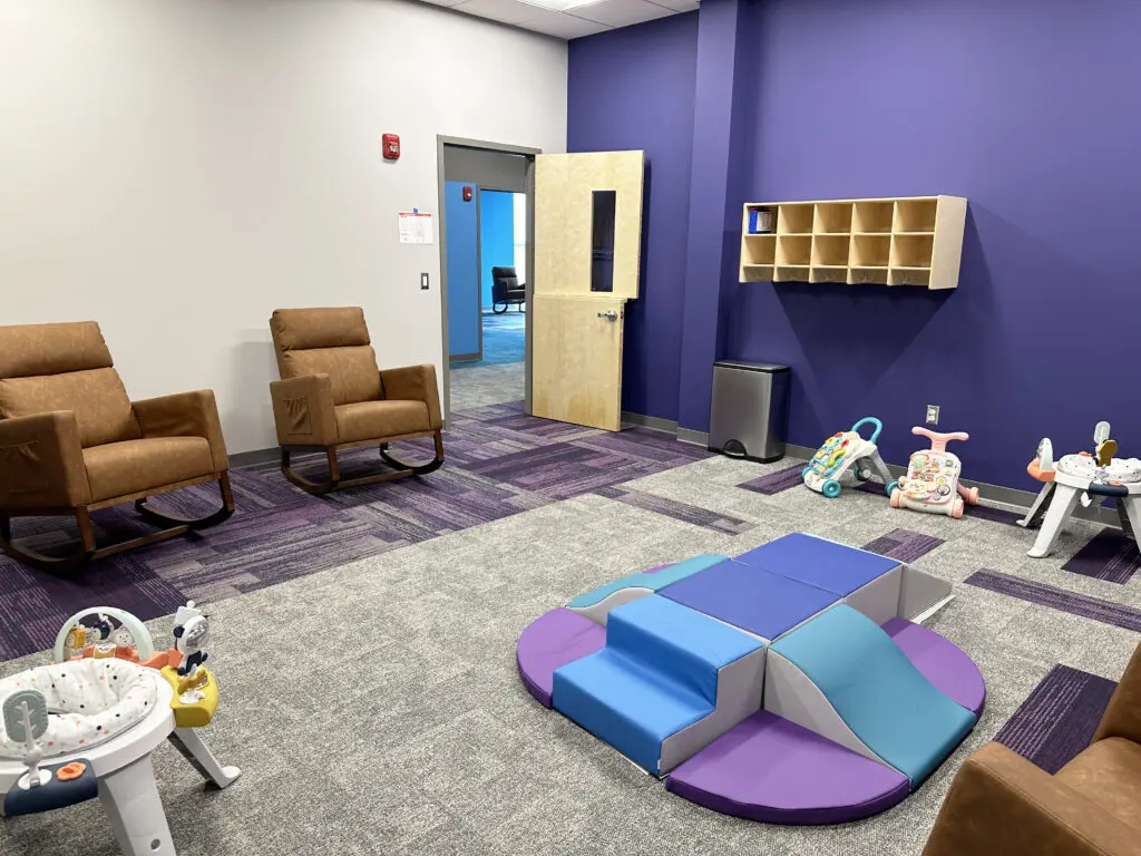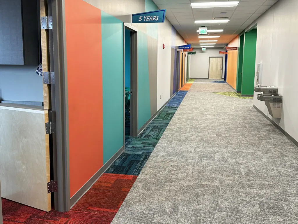 Children are welcomed into a playful space complete with a rock-climbing wall, activity panels, and an 8’ long modern light bright. Classrooms are equipped with room-identifying color schemes and furniture that supports a variety of needs.