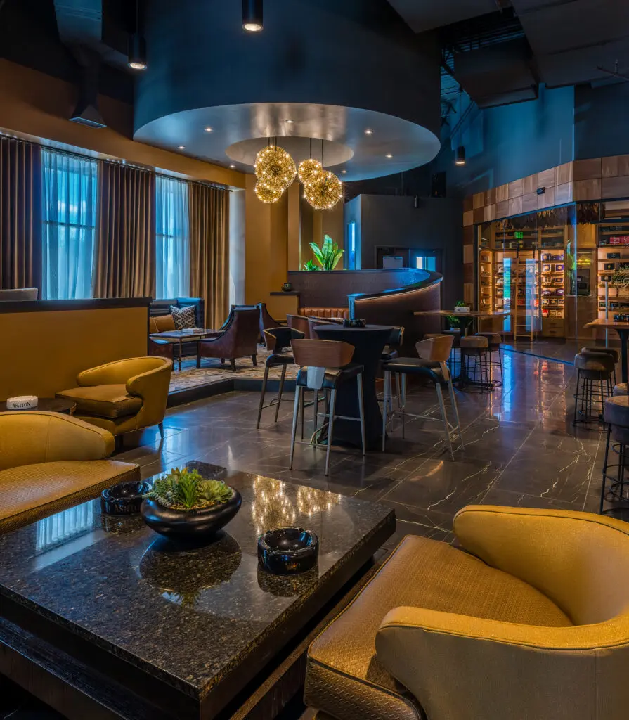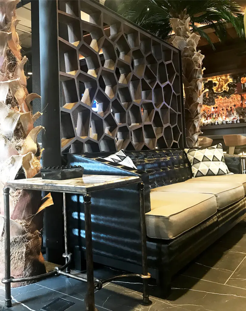 Havana Cigar Lounge is an upscale cigar lounge with an eclectic mix of Havana and urban-industrial inspiration. The late owner, Omar Barham, wanted guests to feel like they entered a luxurious escape in the middle of the city. Rich details and moody lighting enhance your experience and draw attention to the 16’ preserved palm trees.