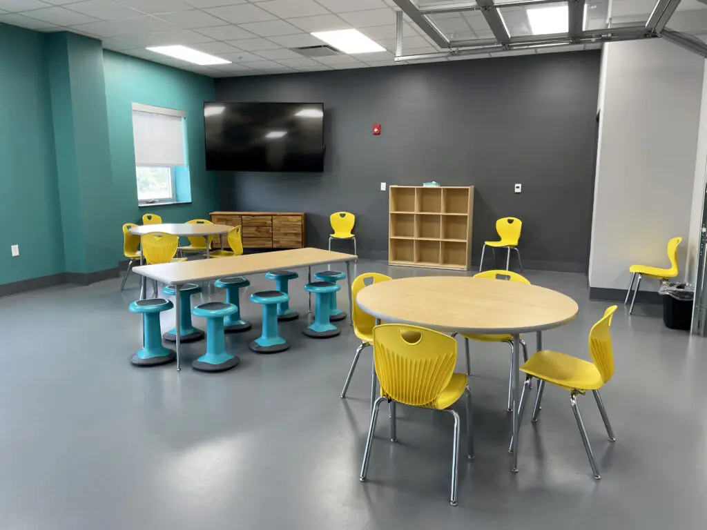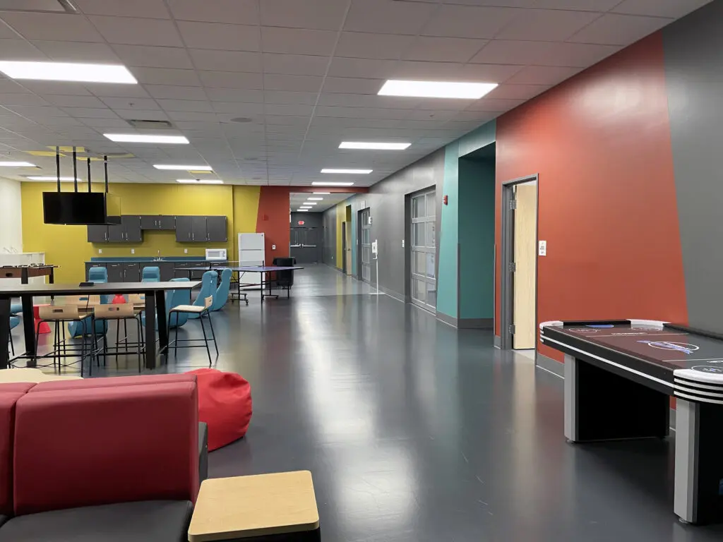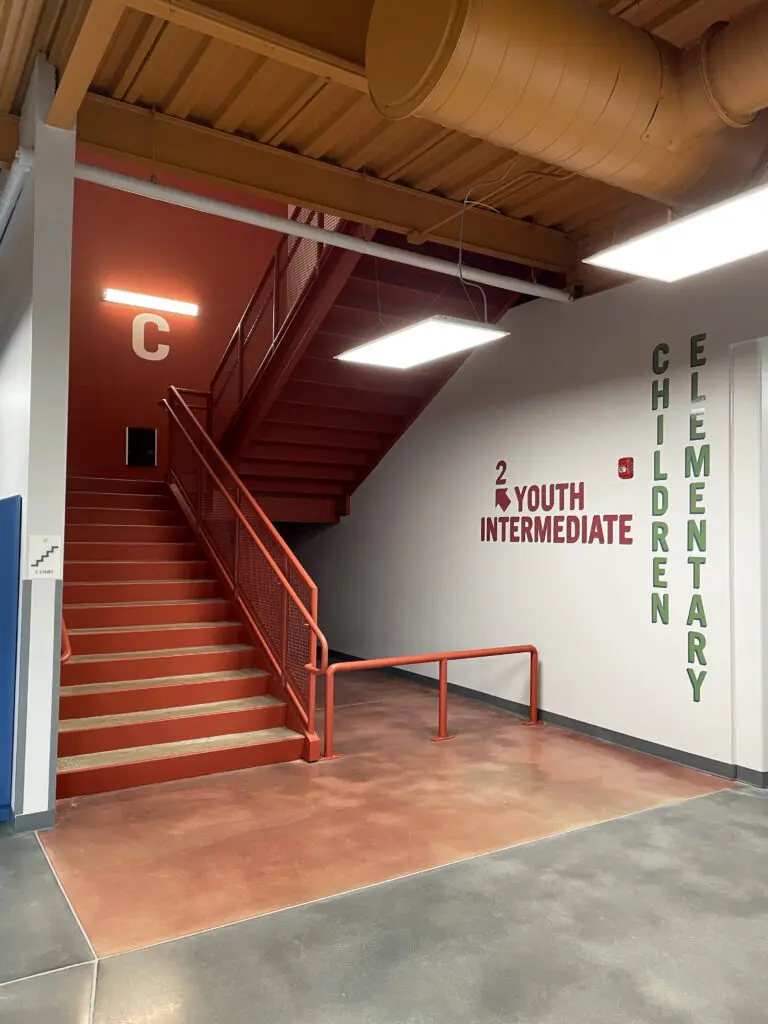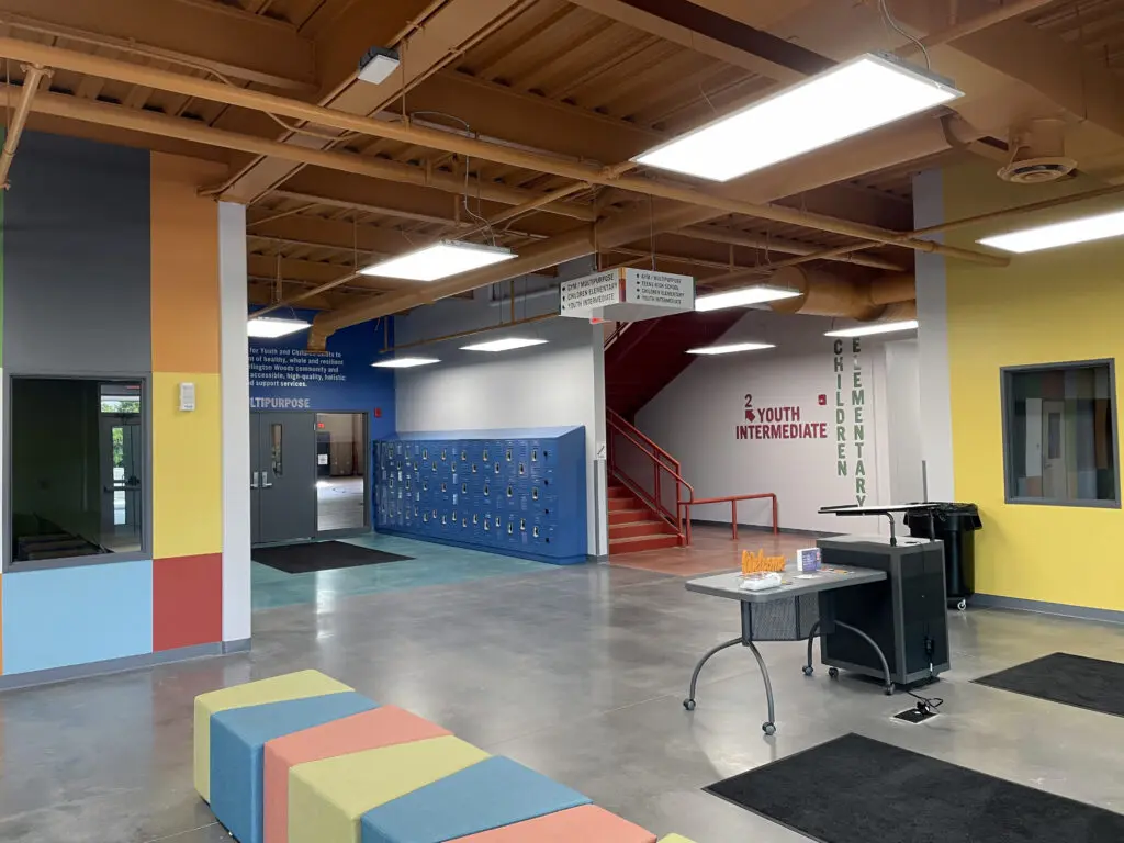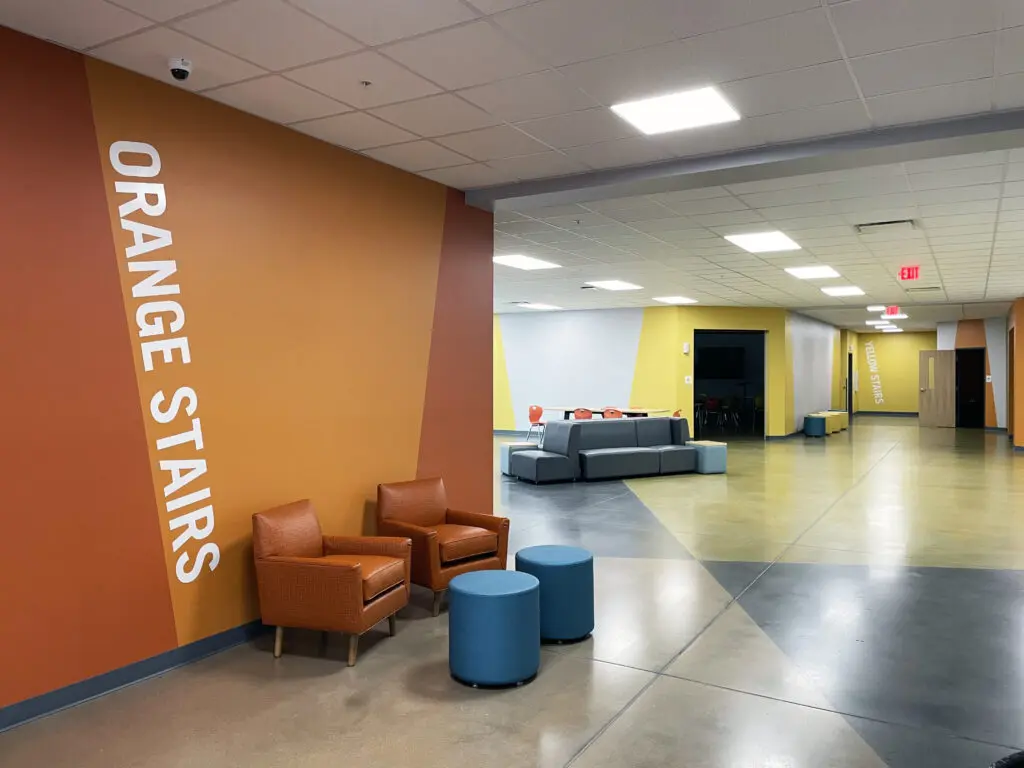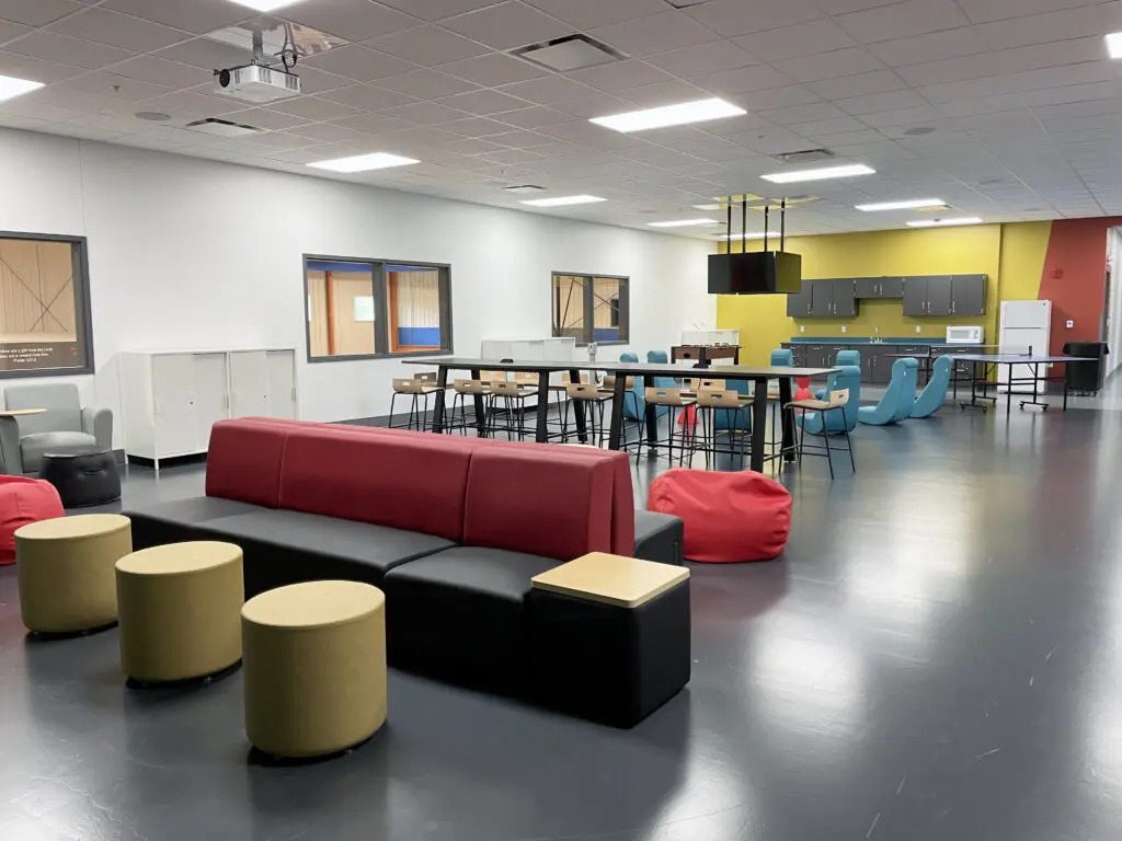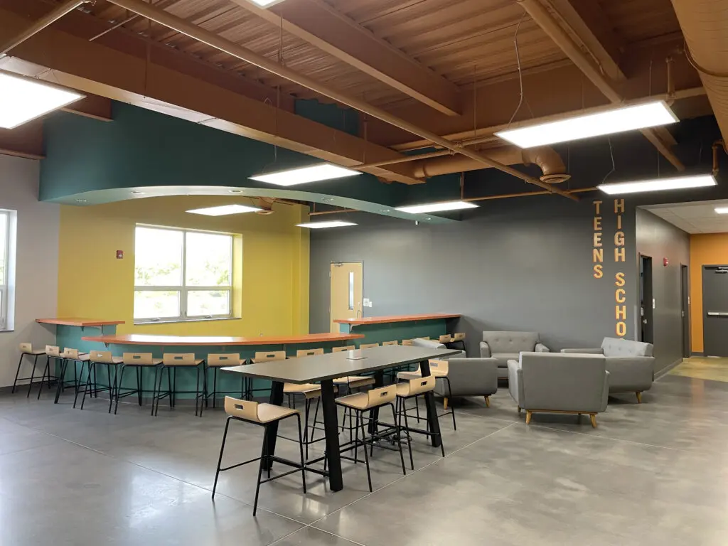 Spaces are designed with different age groups in mind. The pre-school, middle school, and high school spaces have different features and color schemes but are all focused on one thing – giving children and youth a safe place to gather.